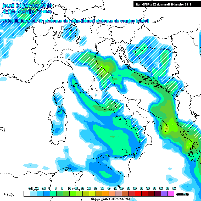 L'impatto con la terraferma andrà a generare un profondo minimo depressionario sulla Francia centrale richiamando, a sua volta, ulteriore aria fredda atlantica da nord ovest e un leggero contributo di aria artica marittima. Nella notte su mercoledì l'aria fredda in ingresso sul Rodano avrà generato un altro minimo, sul Ligure, questa volta.