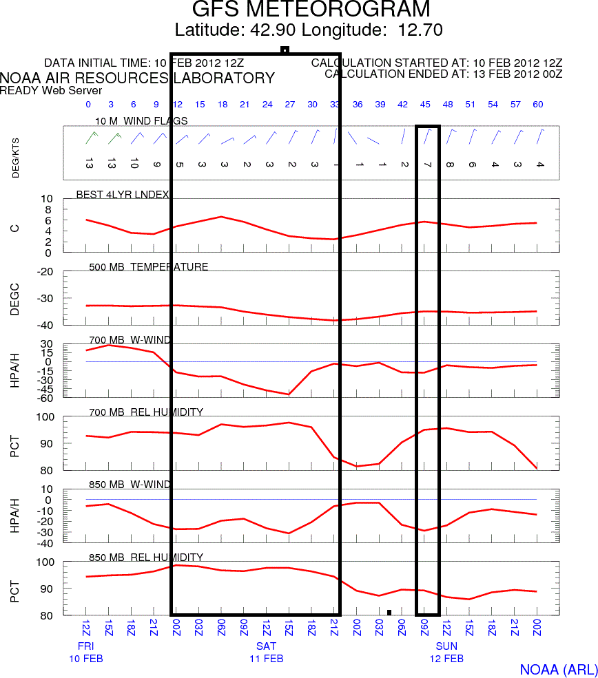 Meteogramma GFS12!!!! Ce lo volevamo negà? E' comunque sulla linea di quello precedente. Un sabato di tutto rispetto, dominato dall'occlusione legata alla risalita del minimo. Molto lunga e significativa la strisciata utile per la neve, a partire da stanotte.