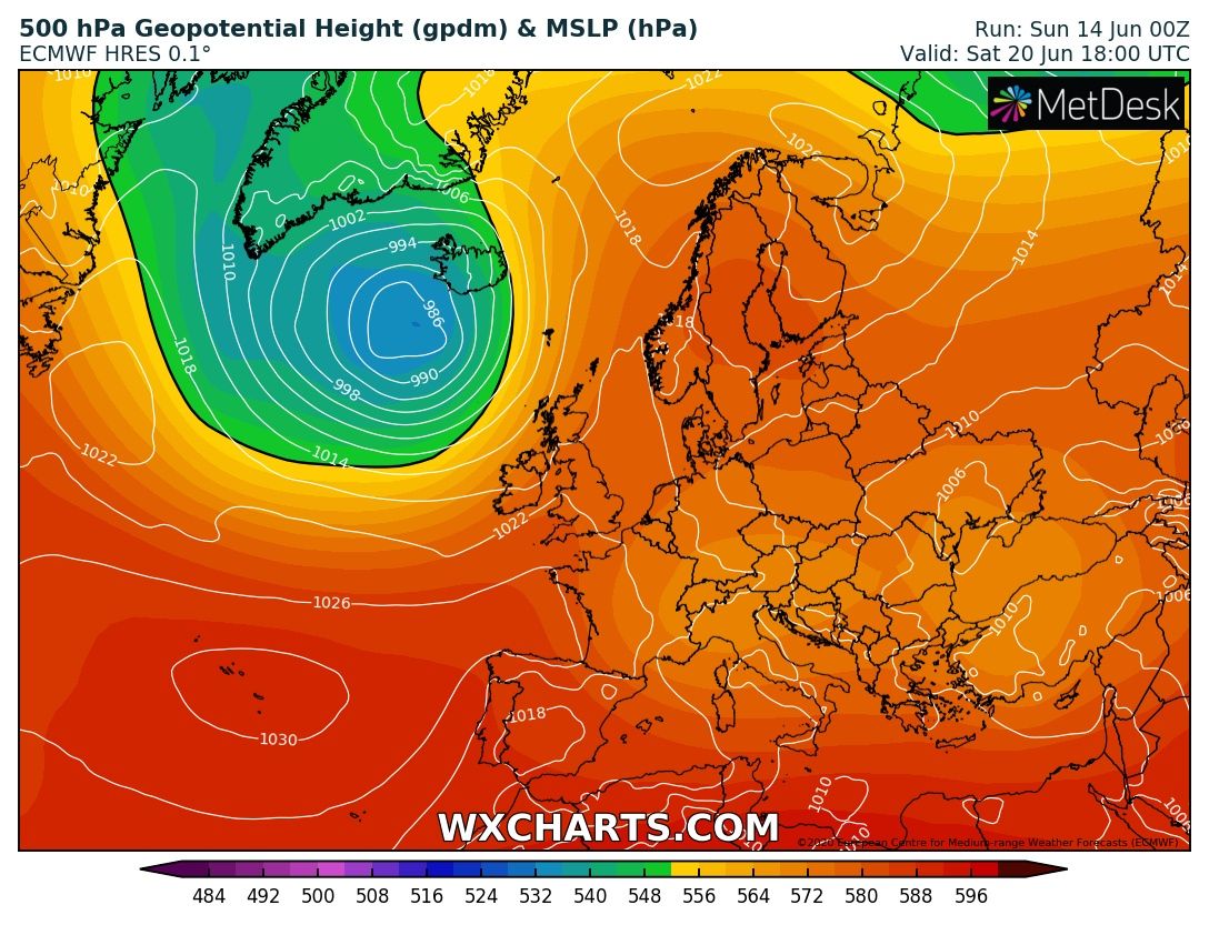La vede più rosea e calda GFS (3'immagine) sul lungo piazzando un vortice britannico (e Scand non troppo+) , una leggera risalita di GPT in Groenlandia e un mix afroazzorriano sotto e comunque una risalita termica dopo il solstizio su valori prettamente estivi, come si notava ieri.