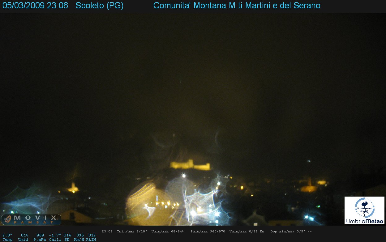 Buongiorno! Intensi rovesci misti a grandine ieri sera, con forte vento. Temperatura crollata sui 2 - 3 gradi in breve tempo. Bel risveglio stamattina con montagne di nuovo bianche fino in collina. Splendidi i monti martani e l'appennino umbro - marchigiano. Ora il cielo è parzialmente nuvoloso per nubi alte. Temperatura minima di 1 grado.