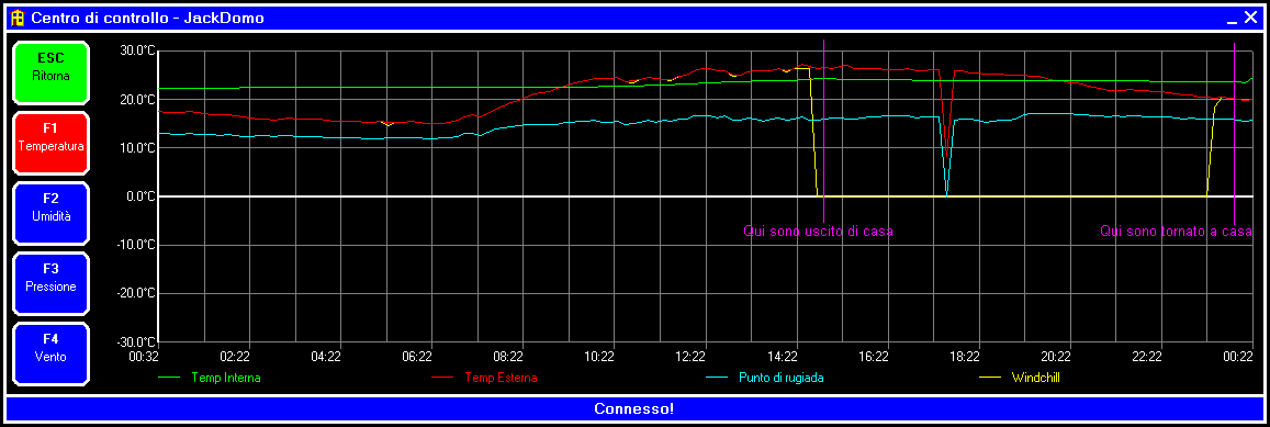 Al ritorno a casa ho visto che si era magicamente sistemata da sola, ma guardando il grafico (allegato) mi sono accorto che per tutto il pomeriggio non ha ricevuto i dati dell'anemometro (nel grafico lo si deduce dal windchill a 0), e che mezz'ora prima che tornassi a casa ha magicamente ritrovato il sensore... e mi sono anche accorto che a metà pomeriggio mi ha visto una minima esterna di -9 gradi!