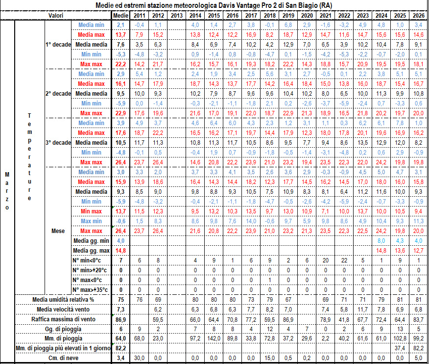 Di seguito il confronto di marzo 2026 con lo stesso mese degli altri anni a San Biagio (RA).
