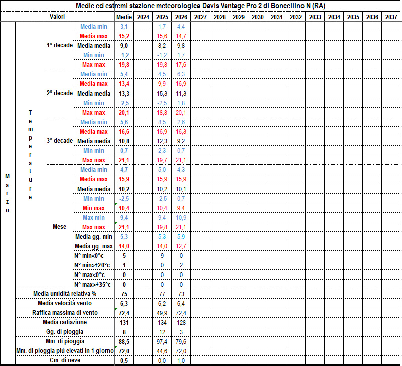 Di seguito il confronto di marzo 2026 con lo stesso mese degli altri anni a Boncellino NW (RA).