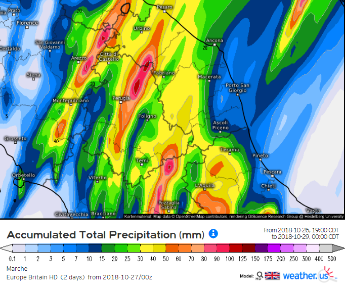 Penso si riferisca alla Valle Umbra. Alcune zone Occidentali sono alla portata dei 100. La maggior parte della regione alla fine, secondo me, si atteaterà sui 50/70 mm