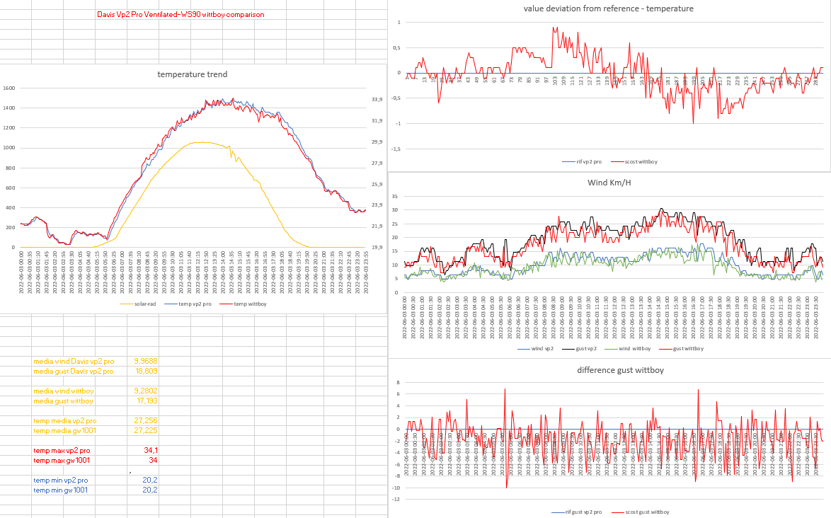 giornata rovente quella di ieri che ha fatto registrare una massima di 38.4° (2° valore piu' alto di questo anno) questi i risultati ... strabiliante prestazione del davis 7714 con sensore EP all'interno buine prestazioni dei 2 metspec le ecowitt tutto sommato si difendono (meglio la vn1900) il lastem fa quel che può, per la vp2 pro ventilata , vale sempre lo stesso discorso , finchè il vento si mantiene debole (sotto i 5 km/h) è insuperabile , quando invece il vento aumenta , la situazione cambia nel confronto anemometrico da notare la WS68 (ecowitt )perfettamente allineata con il sensore vento della davis vp2 pro