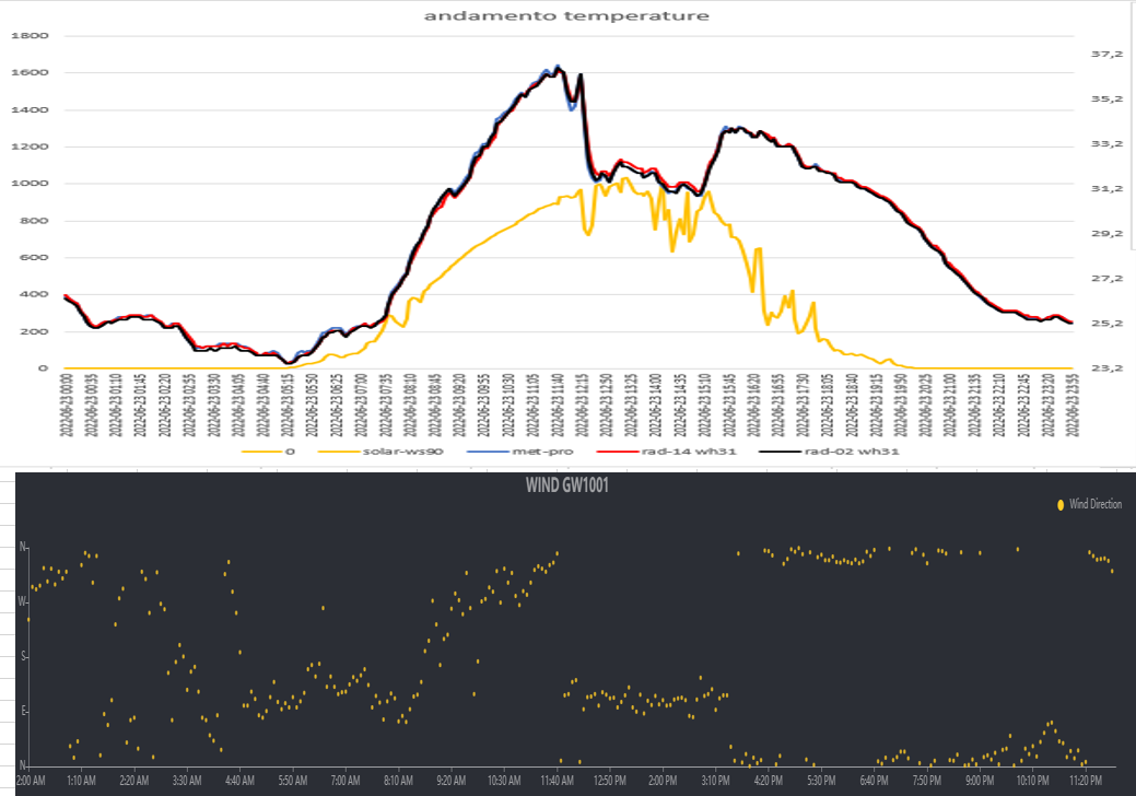 Gionata emblematica per stabilire la qualità di uno schermo o stazione , ma anche di capire l'importanza del vento nella misurazione della temperatura ,dal sorgere del sole fino alle 10:30 della mattina vento quasi del tutto assente , guardate l'andamento delle ecowitt , poi l'andamento degli schermi solari, c'è un mondo  con questo non voglio dire che le AIO non sono buone o cose del genere , anzi... ma solo che stiamo su due livelli differenti ,  anche VP2 pro ventilata in queste situazioni da il meglio di se , vi auguro una buona visione