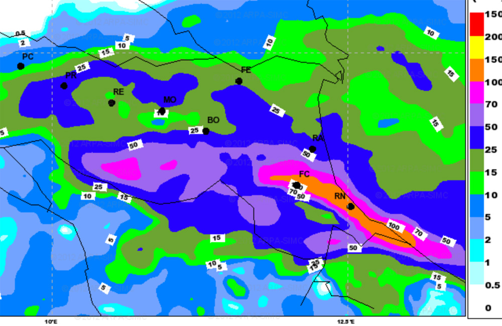 Oltre 100 mm previsti sino alle 21 di domani da Gabiccie a Faenza.