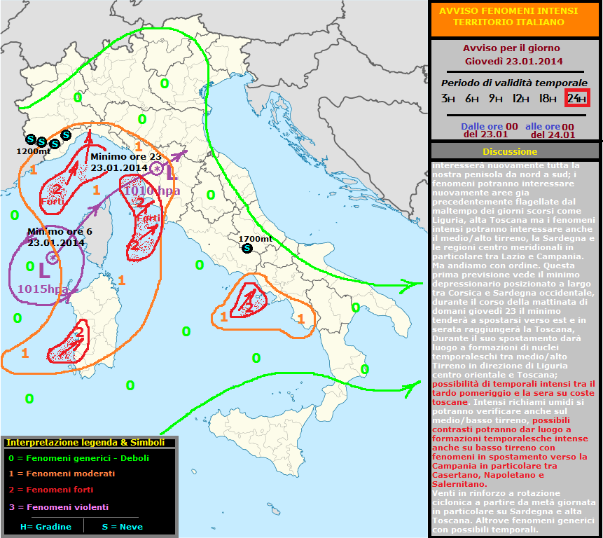 [Flash - Avviso condizioni meteo avverse per Giovedì 23.01.2014] - Nuova perturbazione in arrivo sulla nostra penisola. Stando alla situazione prevista dai vari modelli a breve termine dobbiamo prepararci a una nuova fase di generale maltempo in particolare tra domani giovedì 23 e dopodomani venerdì 24. Vista la particolarità previsionale abbiamo preferito fare un "avviso" solo per le prossime 24 ore focalizzato nella giornata di domani (giovedì 23) ove i fenomeni saranno generalizzati su gran parte delle regioni centrali e settentrionali e con probabilità di nuove formazioni temporalesche di forte intensità , questo a causa di richiami umidi, in particolare, dai modelli sviluppati in queste ultime ore, le zone interessate saranno la Liguria centro orientale, la Versilia e le coste Toscane. Piogge intense previste anche su medio basso Tirreno in direzione del basso Lazio e Campania anche qui possibilità di formazione di intensi sistemi temporaleschi. Nella giornata di domani il minimo depressionario si muoverà in direzione della Toscana con successivo coinvolgimento di precipitazioni e fenomeni, localmente intensi anche su regioni centrali. Va precisato che le temperature sono previste da giovedì sera in calo in particolare al nord e al centro. Nella giornata di venerdì 24 la neve potrà tornare a cadere anche sul settore appenninico centrale. Per il momento ci fermiamo qui, in giornata o in serata vi daremo ulteriori aggiornamenti e faremo chiarezza anche sull'andamento per la giornata di Venerdì 24. Seguiranno aggiornamenti.