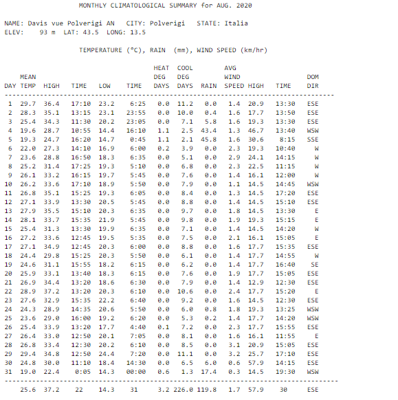 Agosto abbondantemente sopra la media termica e anche sopra la media pluviometrica. Un abbinamento che si verifica per la prima volta in quasi 30 anni di osservazioni. Fino al 2010 infatti ogni singolo agosto con pioggia sopra la norma aveva visto anche temperature SOTTO la norma. Solo per fare qualche esempio abbastanza recente senza andare a finire nel secolo scorso: il 2002, il 2005, 2006, 2007 e 2010. ultimi casi "fuori tempo massimo" furono il 2014 e 2016. Poi nel 2013, 2015 e 2018 già le cose cambiano con precipitazioni superiori alla norma e temperature in media o leggermente superiori ad essa. Quest'anno finalmente un abbinamento che consacra il clima 2.0. Precipitazioni +118% rispetto alla norma e temperature ben +1,5 gradi sopra la media 1993-2017. L'ideale per le zanzare che si stanno godendo alla grande il GW.
